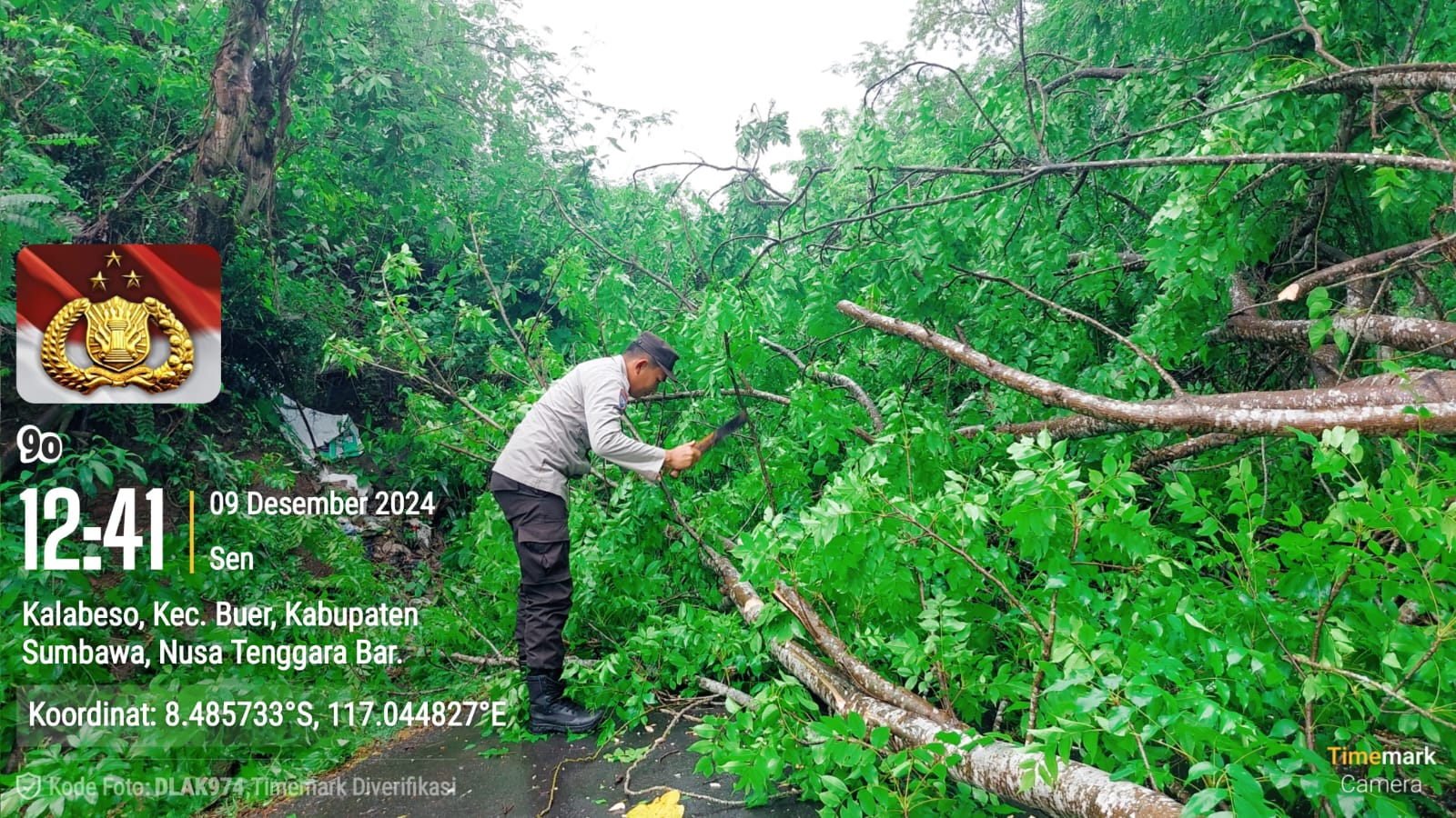 Sumbawa Besar-NTB – Personel Polsek Buer berhasil melakukan evakuasi cepat terhadap pohon tumbang yang menutupi jalan di Jalan Lintas Desa Tarusan menuju Desa Kalabeso, Sumbawa, pada hari Senin (9/12/2024) sekitar pukul 12.30 Wita.