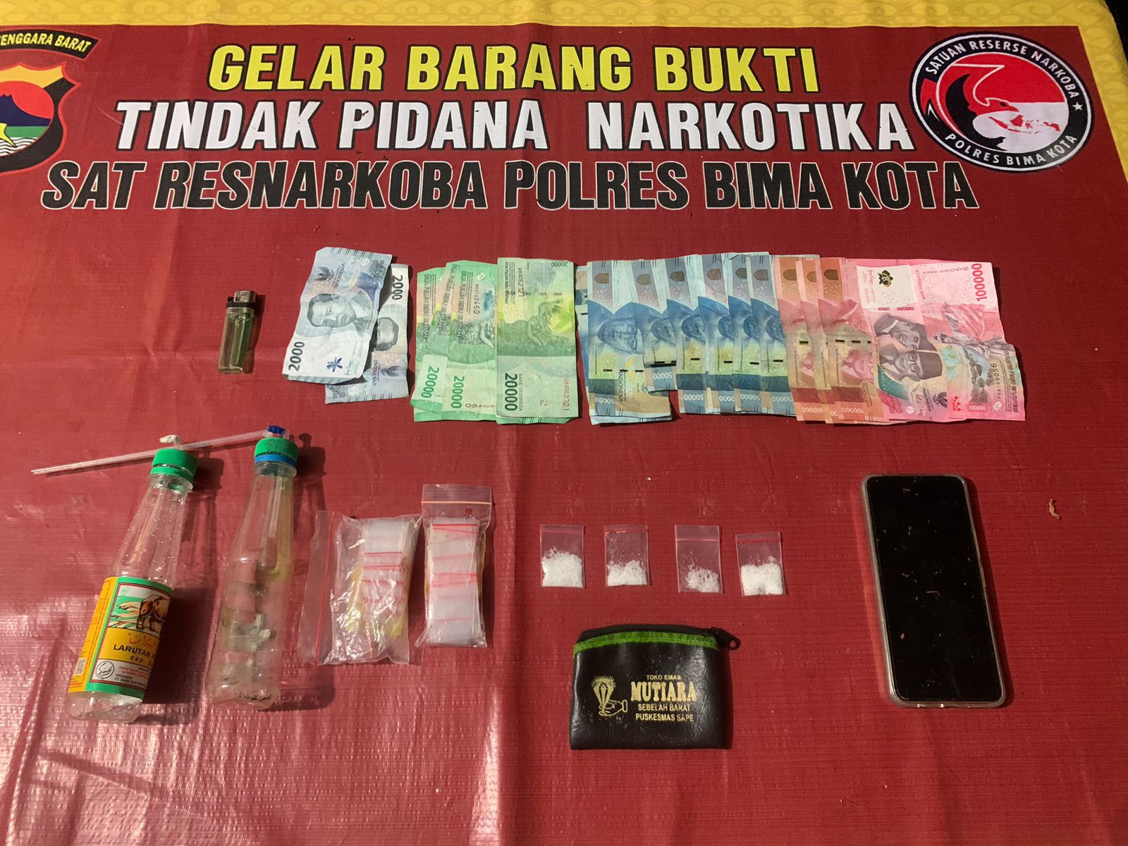 Dari hasil penggeledahan, tim berhasil menyita sejumlah barang bukti, di antaranya 4 lembar plastik klip berisi serbuk kristal diduga sabu, 2 bungkus plastik klip kosong, 1 unit handphone, Korek gas, Uang tunai lebih dari Rp 1 juta, Botol plastik larutan penyegar dan Dompet kulit