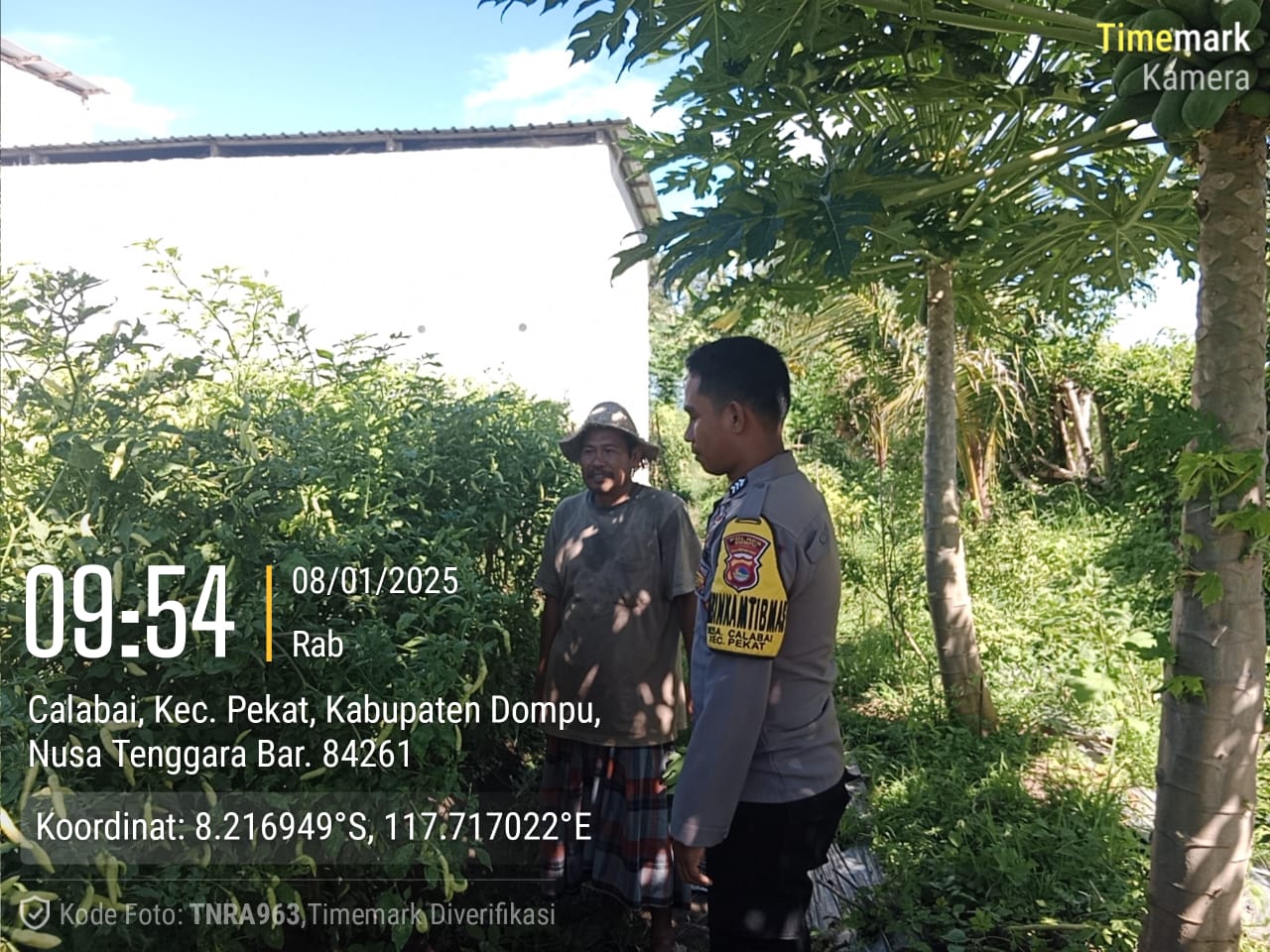 Dalam upaya mendukung pelaksanaan Program Ketahanan Pangan Nasional Menuju Indonesia Emas 2024, Bhabinkamtibmas Desa Calabai, Polsek Pekat, BRIGPOL Imran, melaksanakan pemantauan lahan milik Sdr. Usman di Dusun Jonggat, Desa Calabai, Kecamatan Pekat, Kabupaten Dompu, pada Rabu (08/01/2025).