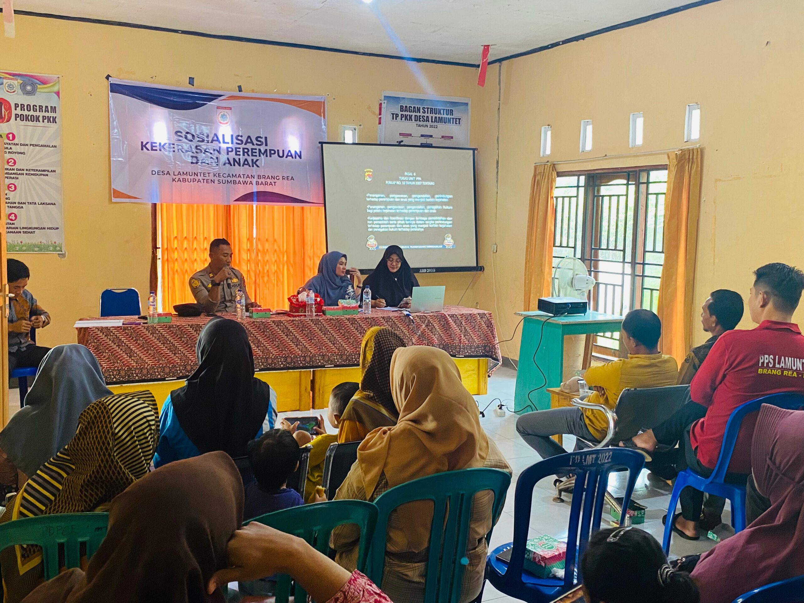 Acara sosialisasi diawali dengan sambutan Kepala Desa Lamuntet dilanjutkan penyampaian oleh Kapolsek Brang Rea dan narasumber dari Dinas P2KBP3A Kabupaten Sumbawa Barat yaitu Ns. Ayu Dwi H., S.Kep., M.M.Inov., dan Fatrianingsih, S.A.P., M.M.Inov., yang memberikan sosialisasi upaya antisipasi kekerasan terhadap perempuan dan anak.