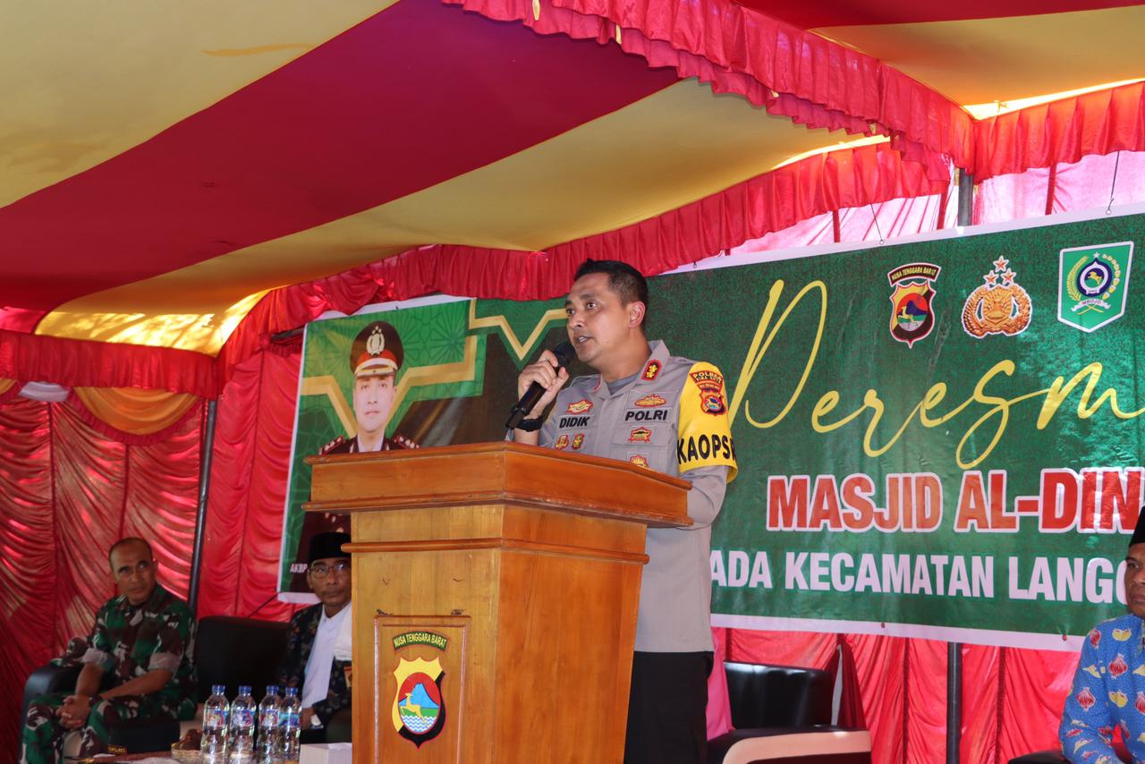 Dalam sambutannya, Kapolres Bima Kota menyampaikan rasa syukur dan apresiasi atas terwujudnya pembangunan Masjid Al-Dinara. Masjid tersebut, menurut Kapolres, merupakan sumbangan dari seorang hamba Allah yang merupakan petinggi Polri. “Proses pembangunan masjid ini memakan waktu, tenaga, hingga akhirnya kita dapat menyaksikan hasilnya pada hari ini,” ungkap AKBP Didik.