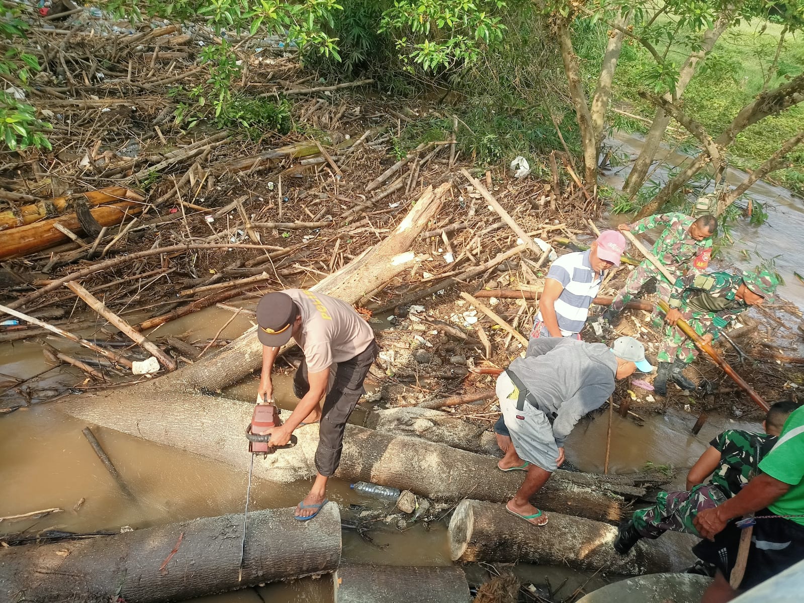 Dalam kegiatan gotong royong tersebut, personel TNI-Polri bersama warga saling bahu-membahu membersihkan tumpukan sampah di area jembatan. Tampak dalam kegiatan itu Kapolsek juga turun langsung ke aliran sungai untuk memotong batang kayu yang besar menggunakan mesin pemotong sehingga mudah untuk di angkat.