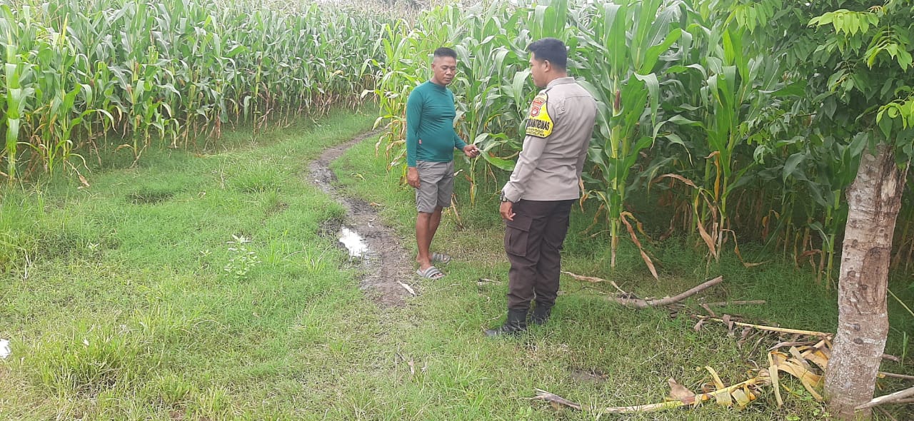 Dalam kegiatan ini, Brigadir Khairul Anwar melakukan pemantauan langsung terhadap lahan pertanian milik Bapak Sukrin yang telah ditanami jagung.