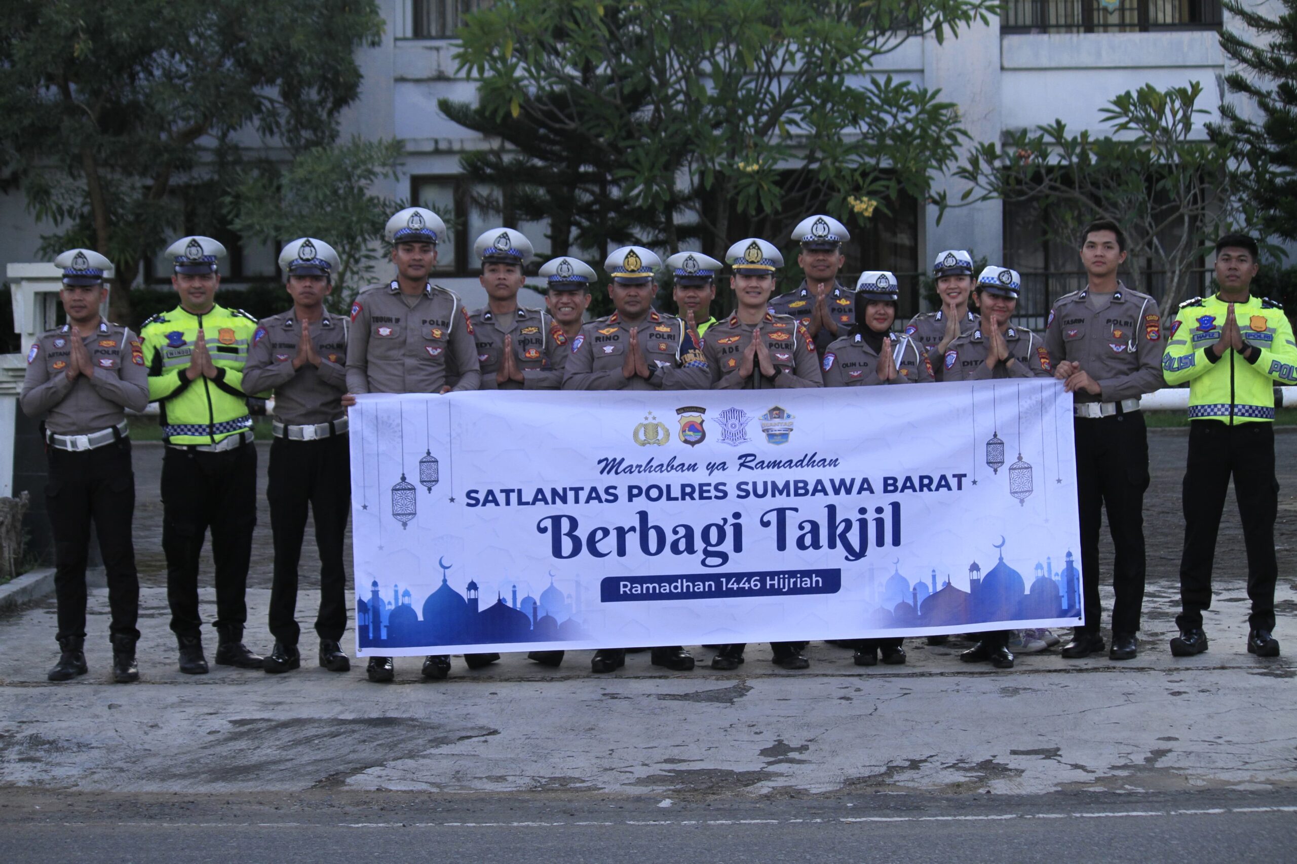 Sumbawa Barat, NTB – Menyambut bulan suci Ramadhan, Sat Lantas Polres Sumbawa Barat menggelar kegiatan sosial dengan membagikan takjil gratis kepada masyarakat pengguna jalan. Kegiatan ini dilaksanakan pada hari Senin, 10 Maret 2025, pukul 17.30 WITA, bertempat di Simpang 4 Bundaran Pesawat, Kecamatan Taliwang, Kabupaten Sumbawa Barat.
