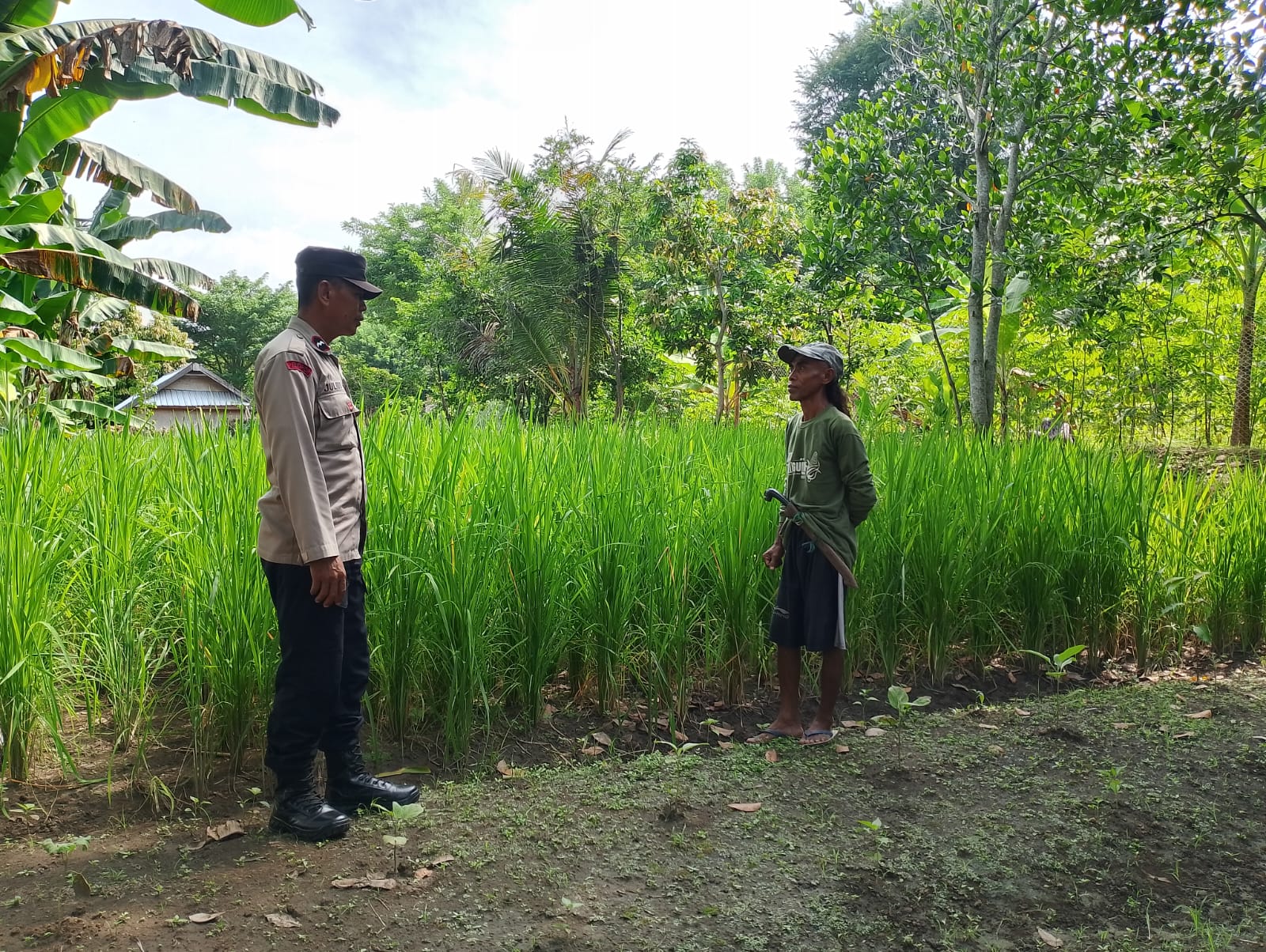 Selain itu, Bhabinkamtibmas juga melakukan pengecekan untuk mengetahui perkembangan tanaman padi yang sedang dirawat serta mendengarkan langsung kendala yang dihadapi oleh petani.
