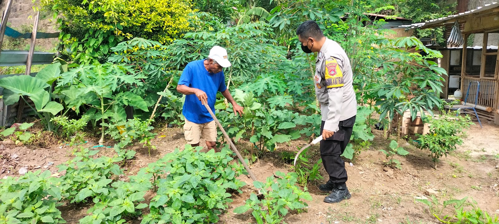 Bripka Ramli mengecek dan memonitor pekarangan bergizi milik warga yang ditanami berbagai jenis tanaman, antara lain cabai, terong, singkong, dan okra. Program Asta Cita Swasembada Pangan bertujuan untuk mendorong ketahanan pangan melalui pemanfaatan pekarangan rumah tangga untuk ditanami tanaman yang bernilai gizi tinggi.