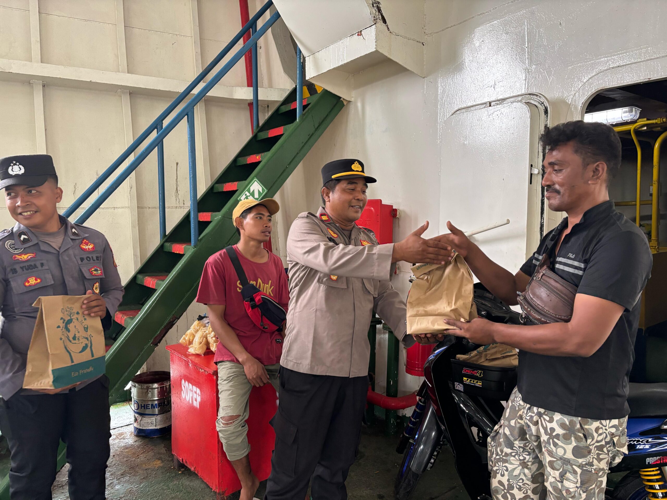 Sumbawa Barat, NTB – Dalam rangka mengisi kegiatan positif di bulan suci Ramadhan 1446 H, personel Polsek Kawasan Pelabuhan Laut (KPL) Tano menggelar kegiatan berbagi berkah berupa pembagian paket berbuka puasa kepada para kru kapal dan pengguna jasa penyeberangan di Pelabuhan Laut Tano. Kegiatan ini dilaksanakan pada hari Selasa, 18 Maret 2025, pukul 17.00 WITA, bertempat di kawasan Pelabuhan Laut Tano.