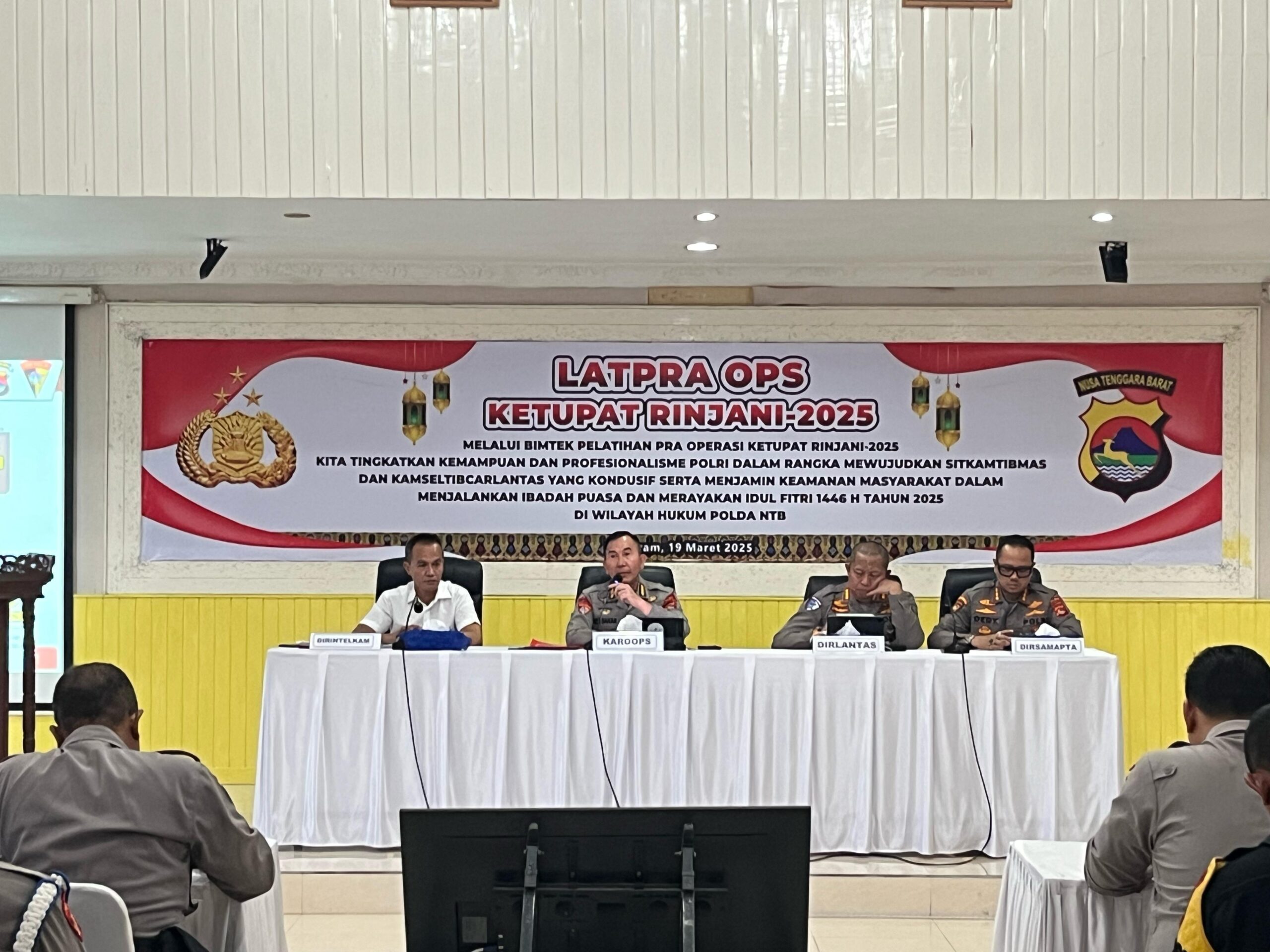 Mataram NTB – Menjelang pelaksanaan Operasi Ketupat Rinjani 2025 yang merupakan Operasi dalam rangka Pengamanan Hari raya Idul Fitri 1446 H, Polda NTB melaksanakan Latihan Pra Ops Ketupat Rinjani 2025 yang dipimpin Karoke Polda NTB Kombespol Abubakar Tertusy S.I.K., M. Han di Gedung Rupatama Polda NTB, Rabu (19/03/2025).