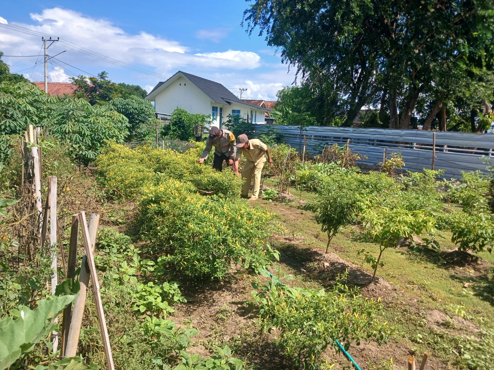 Bripka M. Hairil F. melakukan pendampingan pengelolaan Pekarangan Pangan Bergizi kepada warga binaan, Bapak Sabi Said, selaku pemilik lahan yang ditanami tanaman berupa terong, cabai, pisang, dan singkong.