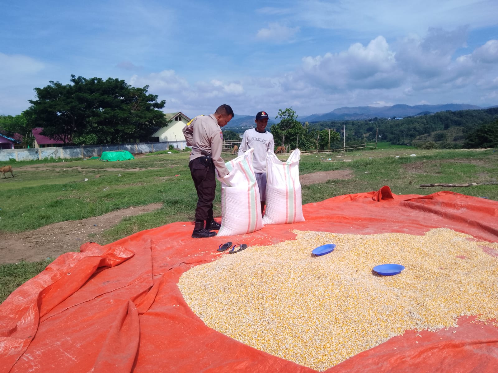 Bhabinkamtibmas Desa Manggeasi, Aipda M. Ali Hanafia, S.Sos., melakukan pemantauan kegiatan panen raya jagung milik Sdr. Abdullah di Dusun Manggeasi, Kecamatan Dompu, Rabu (17/4/2025). Kegiatan ini merupakan bagian dari dukungan terhadap Program Ketahanan Pangan Nasional Menuju Indonesia Emas 2045.
