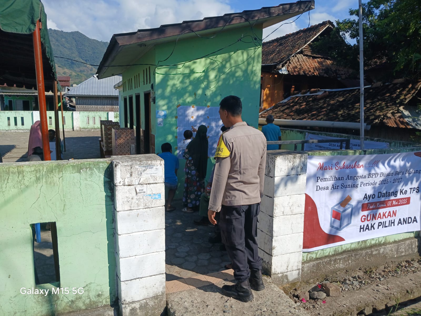 Sumbawa Barat, NTB — Dalam rangka memastikan jalannya proses demokrasi yang aman dan kondusif, Bhabinkamtibmas Desa Ai Suning dari Polsek Seteluk, Polres Sumbawa Barat, melaksanakan pengamanan Pemilihan Ketua dan Anggota Badan Permusyawaratan Desa (BPD) di Dusun Batu Bintang, Desa Ai Suning, Kecamatan Seteluk, pada Kamis (01/05/2025).