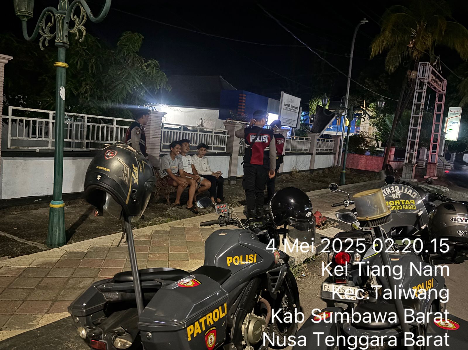 Sumbawa Barat, NTB – Guna menciptakan situasi kamtibmas yang aman dan kondusif, Satuan Samapta Polres Sumbawa Barat menggelar patroli dialogis pada Minggu dini hari, 4 Mei 2025 pukul 02.00 WITA. Kegiatan patroli berlangsung di Lingkungan Tiang Nam, Kelurahan Dalam, Kecamatan Taliwang, Kabupaten Sumbawa Barat, dengan menyasar kelompok remaja yang terlihat sedang berkumpul di beberapa titik.