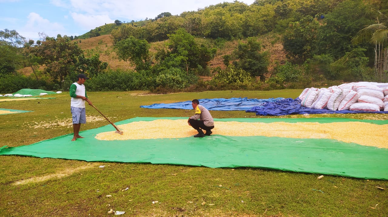 Dalam kesempatan tersebut, Bhabinkamtibmas Desa Batu Putih, Bripka Alfian tidak hanya memantau proses pengeringan jagung, namun juga menyampaikan pesan-pesan kamtibmas kepada petani.