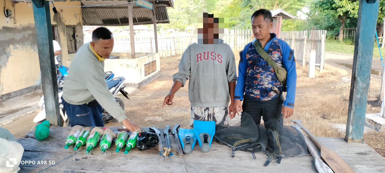 Saat melakukan penggeledahan, petugas berhasil mengamankan barang bukti yang dipakai pelaku ilegal fishing tersebut meliputi 6 buah detonator, 6 buah bom ikan dalam botol bir, 2 masker selam, 3 buah panah ikan, 1 pasan fin, 4 buah serok ikan, 2 buah dayung, 1 buah moutfish dan 1 rol selang kompresor, kantong ikan dan 1 buah kompresor.