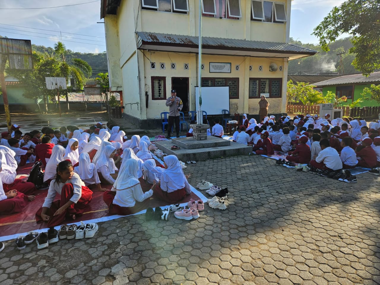 Dalam suasana penuh semangat dan kekeluargaan, para Bhabinkamtibmas turut serta dalam sesi pengenalan lingkungan sekolah, berbincang dengan para guru, dan memberikan pesan-pesan edukatif serta motivasi kepada para siswa.
