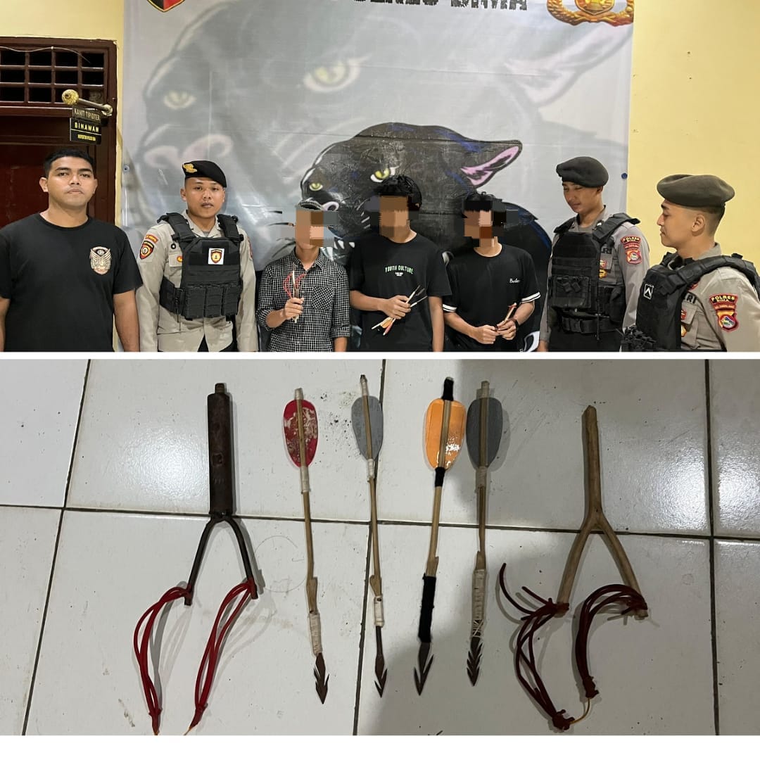 Saat melaksanakan patroli petugas melihat tiga orang remaja yang mengendarai sepeda motor dengan gerak gerik mencurigakan. dan setelah didekati serta dilakukan pemeriksaan atau penggeledahan petugas menemukan 4 busur panah dan ketapel yang diduga kuat untuk melakukan tindakan kejahatan.