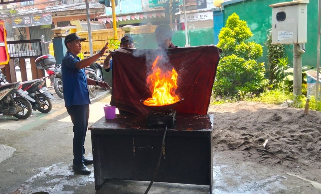 Selain memberikan materi, tim Damkar juga menggelar simulasi penggunaan alat pemadam api sederhana (APAR) serta cara menangani kebocoran tabung gas menggunakan alat seadanya di rumah.