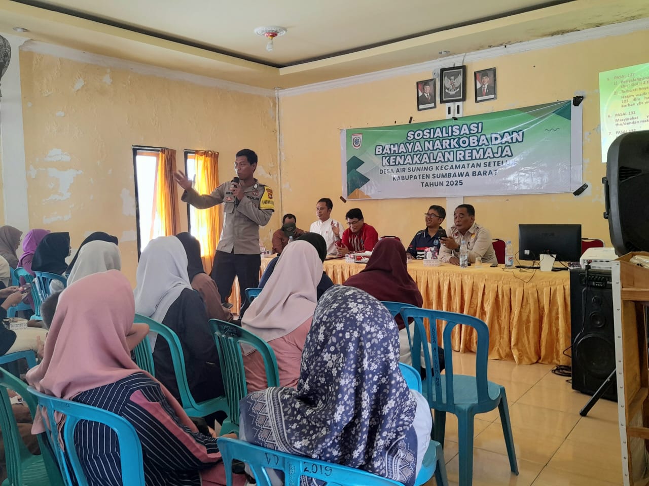 Sumbawa Barat – Dalam upaya meningkatkan kesadaran masyarakat terhadap bahaya penyalahgunaan narkoba dan kenakalan remaja, Bhabinkamtibmas Desa Air Suning Polsek Seteluk Polres Sumbawa Barat, Brigpol Taufik Rahadi, melaksanakan kegiatan sosialisasi bertempat di Aula Kantor Desa Air Suning pada Minggu (2/11/2025) pukul 09.00 Wita.