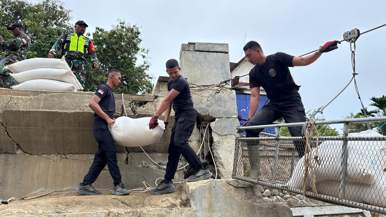 Bireun – Personel SAR Satuan Brimob Polda Aceh membantu menyalurkan bantuan logistik untuk masyarakat terdampak bencana di Desa Kubu, Bireuen, dengan menggunakan jembatan Sling Baja.