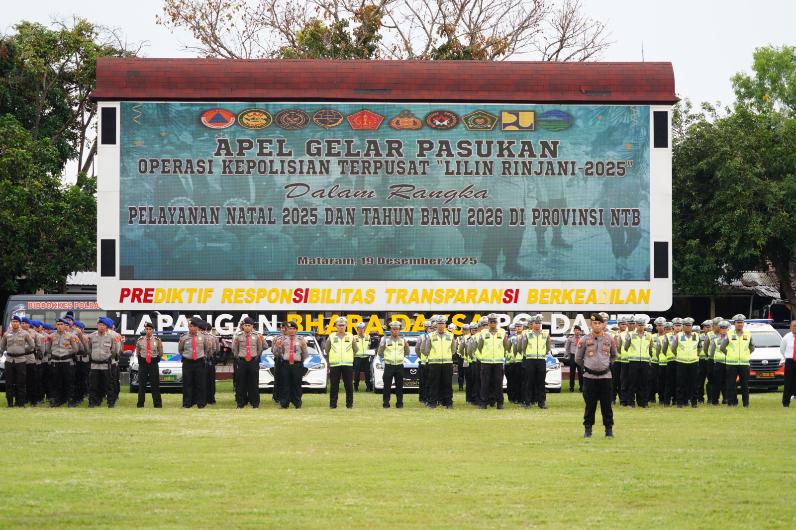 Mataram, NTB – Kepolisian Daerah Nusa Tenggara Barat (Polda NTB) bersama Pemerintah NTB dan Stakeholder terkait melaksanakan Apel Gelar Pasukan Operasi Lilin Rinjani 2025 dalam rangka Pengamanan Natal tahun 2025 dan Tahun Baru 2026 di wilayah Nusa Tenggara Barat, Jumat (19/12/2025).