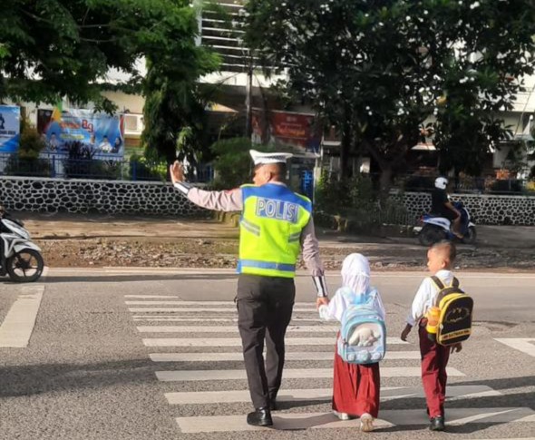 Selain itu, personel turut membantu menyeberangkan pejalan kaki, khususnya anak-anak sekolah dan masyarakat yang hendak beraktivitas, demi terciptanya keselamatan dan ketertiban berlalu lintas.