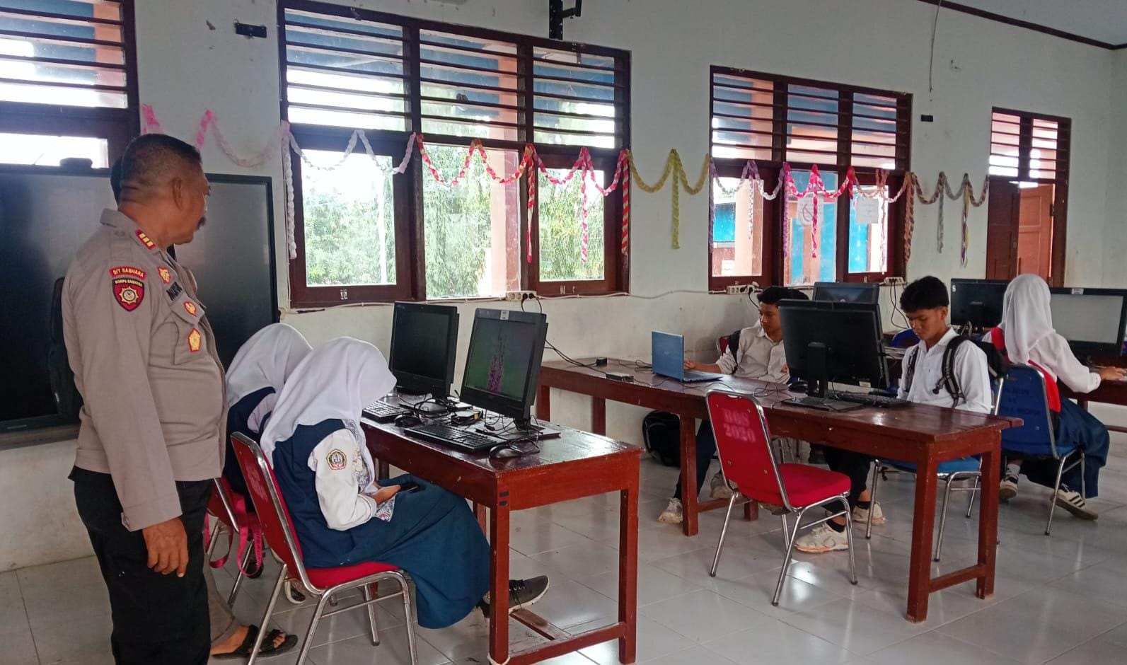 Personel Polsek Woha Polres Bima Polda NTB melaksanakan pengamanan ujian atau seleksi calon siswa baru SMA Kemala Taruna Bhayangkara di SMPN I Woha