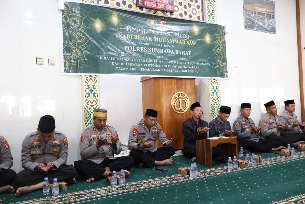 Sumbawa Barat – Polres Sumbawa Barat melaksanakan kegiatan peringatan Isra’ Mi’raj Nabi Besar Muhammad SAW Tahun 1447 Hijriah/2026 M yang berlangsung khidmat, Seluruh peserta tampak khusyuk mengikuti rangkaian acara yang diawali dengan pembacaan ayat suci Al-Qur’an, doa bersama, dan tausiyah keagamaan yang di laksanakan di Masjid Polres Sumbawa Barat. Kamis,(22/01/2026)
